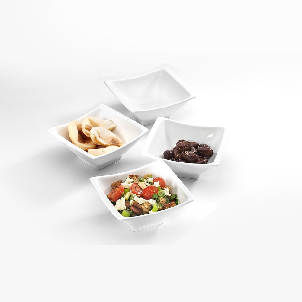 A high quality 4pc set of porcelain square bowls, can be used to serve at various table settings. Symphony is made of the highest-grade porcelain, fired at more than 1340 degrees, giving it strength, durability and a superior hardness in the glazing. It is dishwasher and microwave safe.