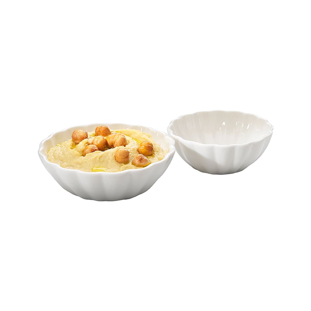 A high quality 2pc set of groove design, round, porcelain dip bowls. It can be used to serve at various table settings. It is perfect for nuts, dips, sauces and more. Symphony is made of the highest-grade porcelain, fired at more than 1340 degrees, giving it strength, durability and a superior hardness in the glazing. It is dishwasher and microwave safe.